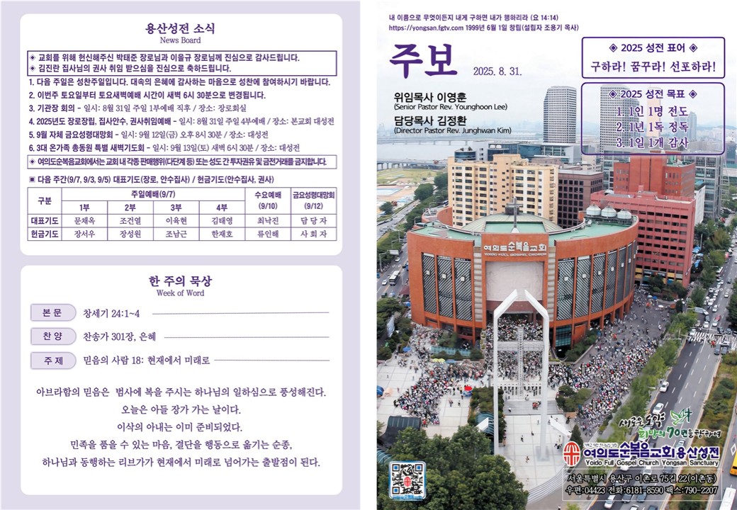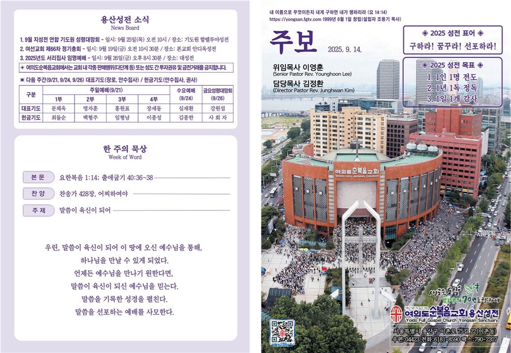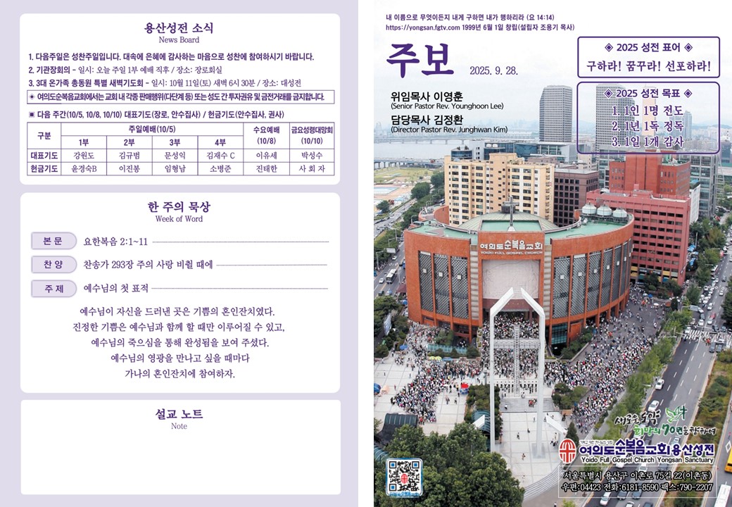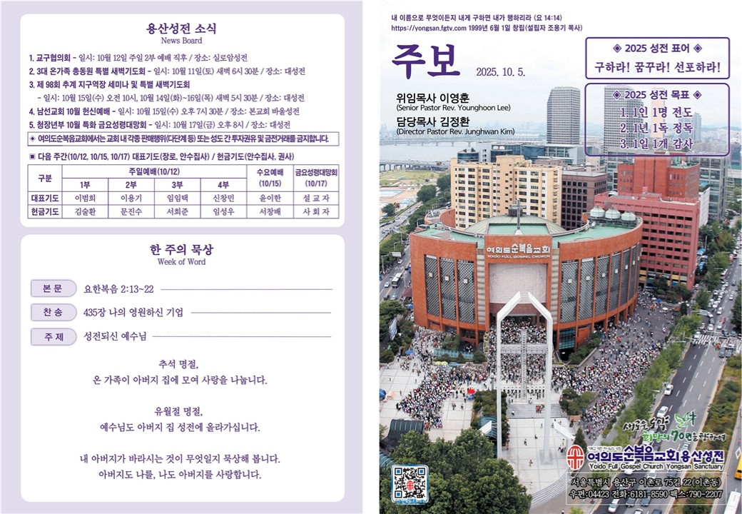 주일1부 예배 금요성령대망회 외부강사 및 특별행사 주보 보기